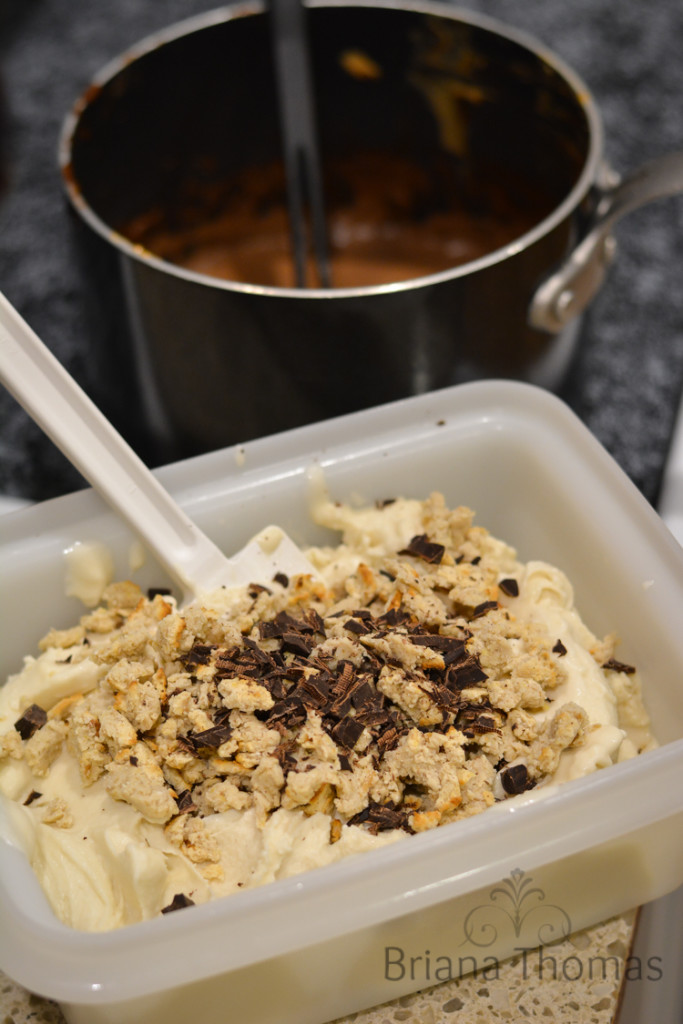 If you don't have an ice cream maker, you could try freezing the mixture in ice cube trays, then blending the cubes in a high-powered blender. You may have to add some almond milk or cream to get it to blend. Stir in the cookie crumbs and chocolate by hand after blending.